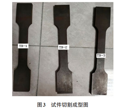 拉伸試件從本材上取樣,尺寸參考GB/T 228.1-2010《金屬材料拉伸試驗第1部分:室溫試驗方法》[8]確定,見圖1。試件長度300mm。共設計三個相同的復合比,編號分別為TB-1、TB-2、TB-3。鋼材基層厚度10mm,鈦層厚度2mm。試件尺寸設計見圖2。切割成型后的試件見圖3。