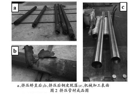 擠壓管材表面質量較好,管材直線度較好,經過機械加工后的管材尺寸滿足設計要求。