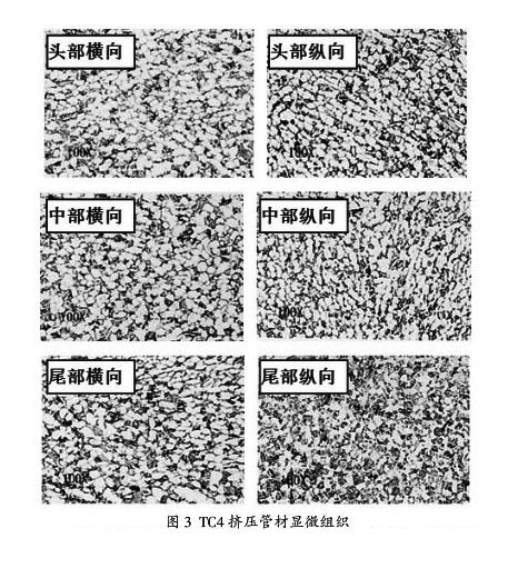 鈦合金擠壓管材在相變點以下40~50℃加熱,在兩相區擠壓變形,并合理控制變形速率,避免變形溫升,管材顯微組織均為兩相區加工組織,顯微組織晶粒沿受力方向被壓扁、拉長。